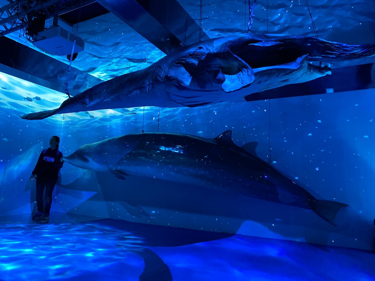 除了綠意盎然的展示外,海洋館「蔚藍脈動」展區也是難得的跨國永續合作,透過美國引進、在地化的「海洋科學序列」打造沉浸式深海體驗,參觀者可使用紫光燈探索自體發光的深海生物,了解深海生物的適應策略;另外,展區也透過「海洋雪」示範碳循環功能,教育民眾永續消費與海洋保育的重要性。