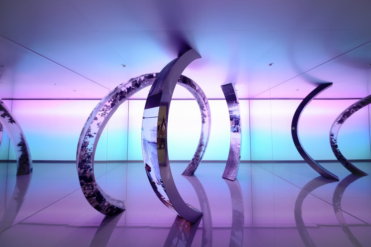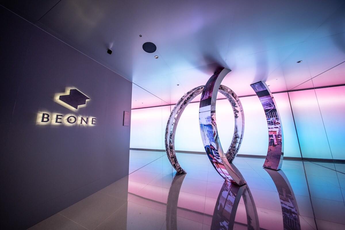 走入BEONE,第一眼即被入口處由澳洲科技藝術團隊ENESS創作的《記憶之輪 Memory Wheel》所吸引。這件裝置藝術以兩個彼此環扣的環形結構,呈現出時間與材料的對話,第一環封存了空間翻新時回收的石材,透明樹脂包覆其中,如同時光膠囊;第二環則以LED播放場域過去與改造過程的影像,並能與觀者互動。
