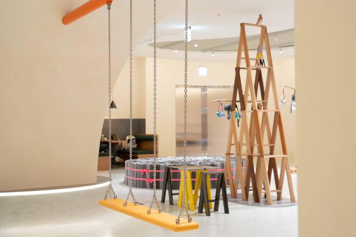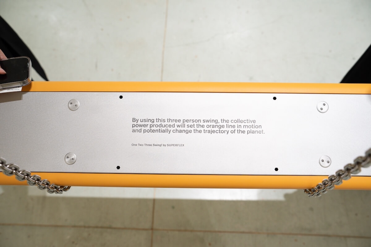 接著,由丹麥藝術團隊SUPERFLEX的作品《One Two Three Swing!》則以三人協作鞦韆的形式,將「共玩」轉化為一種社交節奏,是SUPERFLEX最具代表性的作品,曾在倫敦泰特現代美術館(Tate Modern)展出,也是首次來台亮相。以公共藝術介入城市日常,此作以三人協作鞦韆的律動轉化為社交節奏,邀請觀者透過身體擺盪創造更多互動與共享能量,不僅打破觀展與遊戲的界線,也訴說著永續行動需仰賴多方合作的核心精神。