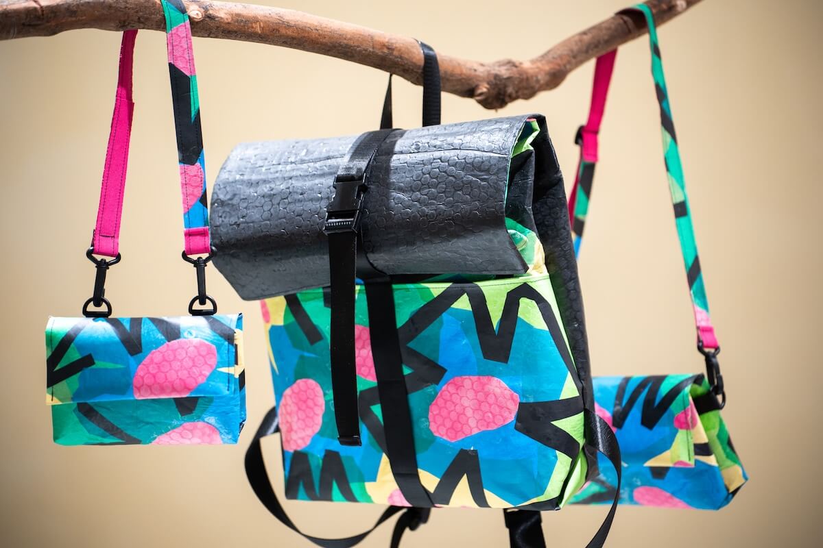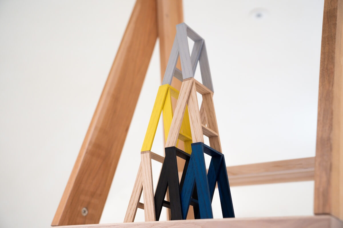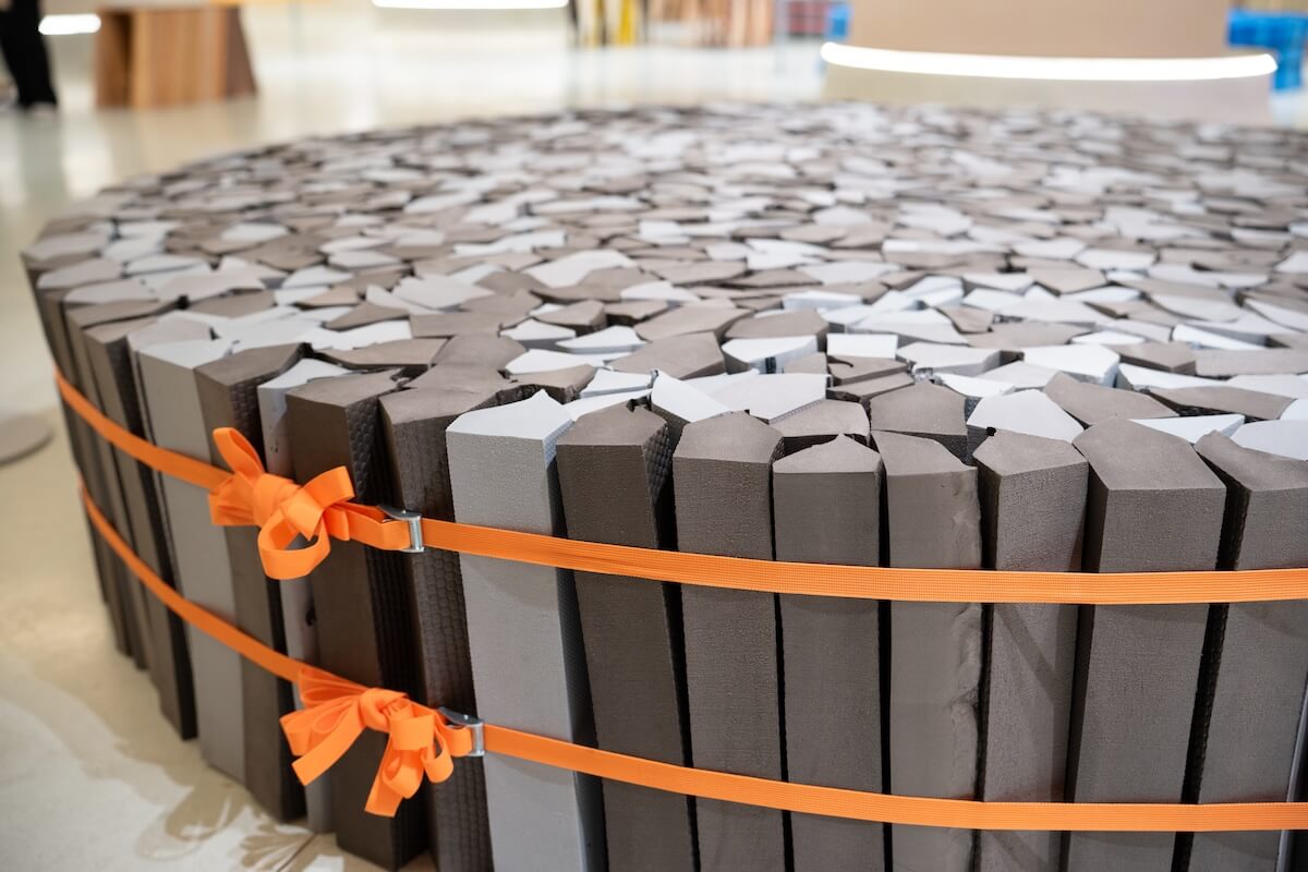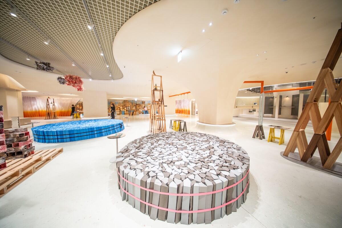 最核心的策展區,則由日本建築設計事務所TORAFU與泰國永續藝術家Bope共同打造,回應日常生活中的永續轉化,展品《AA STOOL》系列強調木材的可塑性,將家具設計延伸至公共遊憩場域,強調人與空間的互動性;Bope則以遠雄集團回收制服布料為素材,創作出漂浮於空中的雲朵藝術、環保手工包袋與大型疊疊樂裝置,賦予廢棄布料全新生命,也象徵快時尚產業下的「布料回生」。