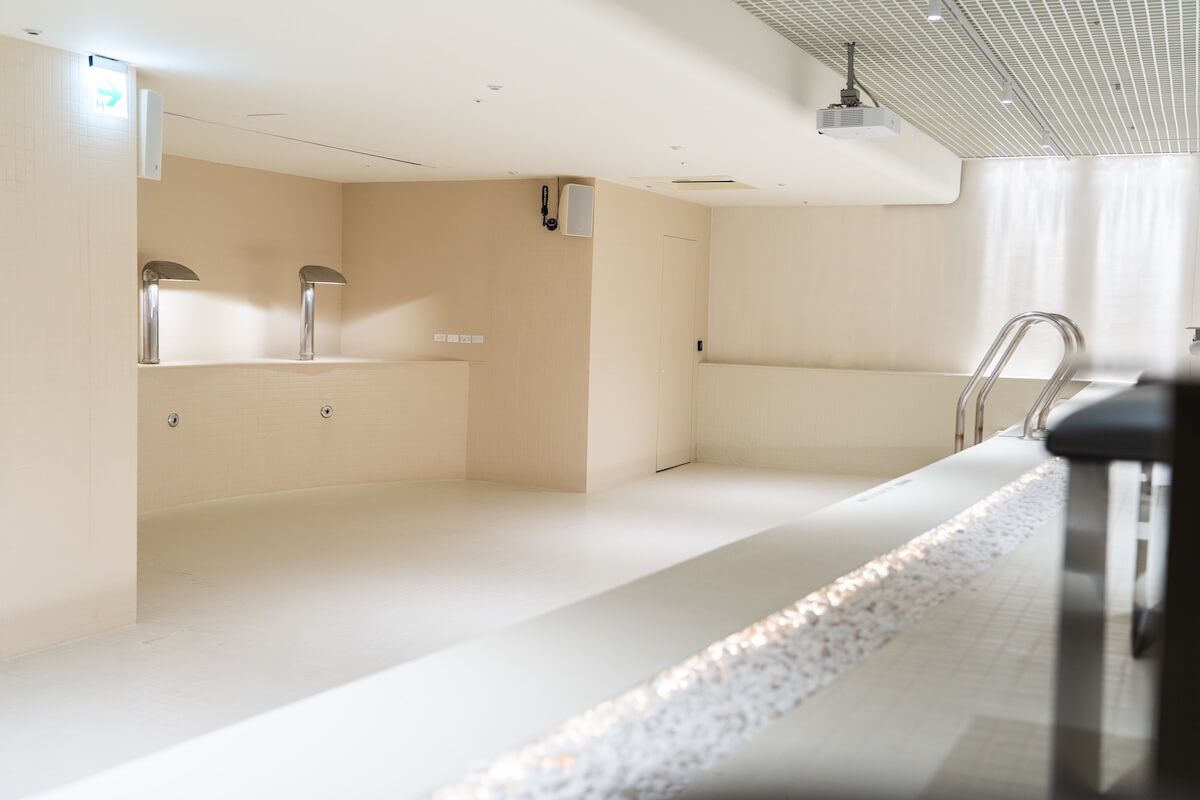 BEONE的誕生,不是拆除重建,而是「低介入改造」,把過去屬於健身俱樂部的泳池、淋浴區與SPA場域,如今轉化為講座劇場、共享空間與展演平台。泳池保留原始階梯與磁磚結構,水療池則成為咖啡廳,連牆上的指示標示與玻璃隔間也被刻意保留,讓記憶在新功能中持續延展。