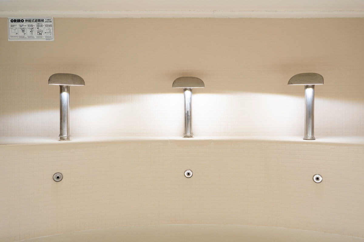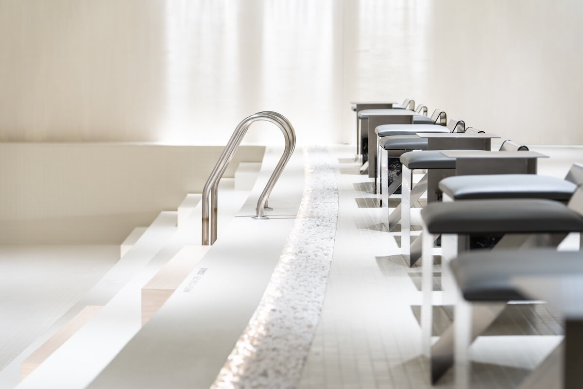 另外,像是水療池與淋浴間場域,巧妙轉化爲咖啡廳用餐區,設計團隊保留原有玻璃隔間與牆面結構,融入燈光與再生建材;而另一側原為泳池的空間,則蛻變為可容納約80人的沉浸式劇場,保留舊有的階梯與磁磚結構重新粉刷,成為拍攝、講座與活動舉辦的多功能平台。