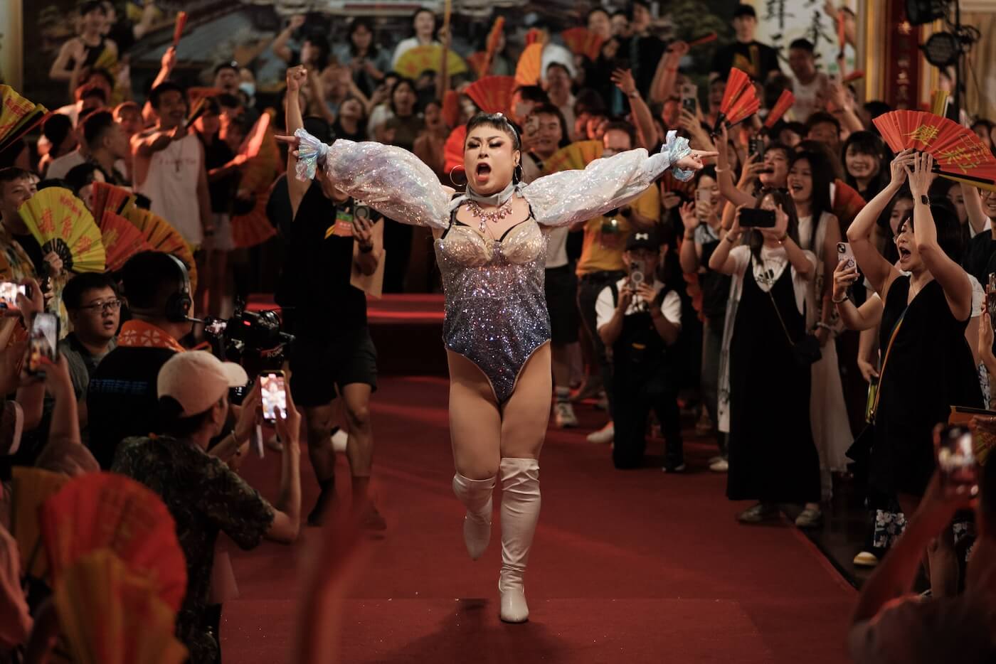 吃飯看秀、擲筊抽籤,台味活動花樣百出。皇后們把表演與菜名合而為一,化身「剝皮辣 Hoe 豬肚盅」、「和瘋中卷佐鮑片」、「黃金 Yugee 放山雞」⋯⋯在笑聲與掌聲間輪番上桌;而 Sandra 則結合母姐會會長、親家母混搭宮廟系主委的形象,穿梭席間與眾人同樂——這份接地氣的熱鬧,遠比夜場的爛醉與獵奇更迷人。