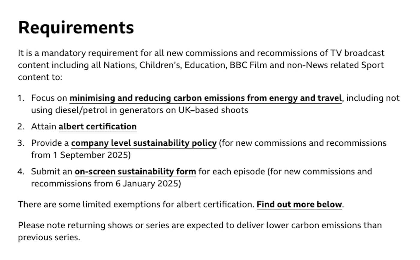 隨著這套機制逐漸成熟,碳足跡計算已從最初的自願性嘗試,演變為英國影視產業普遍遵循的規範。2018 年起,包括 BBC、Channel 4、ITV 與 Sky 在內的電視台,都要求製作團隊計算其節目產生的碳足跡;如今,連 Netflix 在英國地區的製作也全面導入 Albert 系統;BBC 更進一步要求自家的所有委託製作,皆須獲得 Albert 認證才能上架播出。
