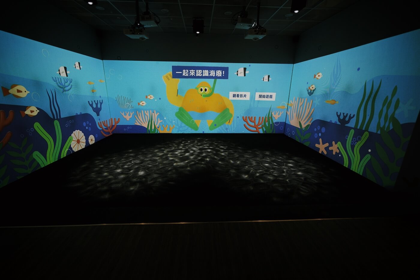 無論是在橫跨三面牆的數位螢幕上模擬海廢撿拾、大富翁遊戲式的鋪地桌遊,還是能隨船舵轉動而帶動教學動畫播放的教具⋯⋯,熟悉教材開發的環境教育講師黃厚嘉分享,設計時除了講求高互動性,也重視結構邏輯能否模組化。