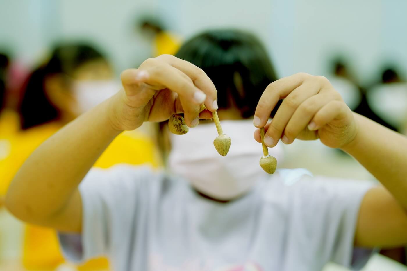 採訪尾聲,正巧遇上臺東縣大王國小的學童前來參訪,午休前的最後一項活動,便是童趣的「香菇陀螺」DIY。只見孩子們圍坐在分組的大桌旁,卯足全力趕工:先撥開檳榔果實的種皮纖維,取出裡頭的褐色種子,再用砂紙細細打磨;接著截一段竹筷,插入種子原本的凹槽。完成後一轉,還真同香菇有幾分相像。