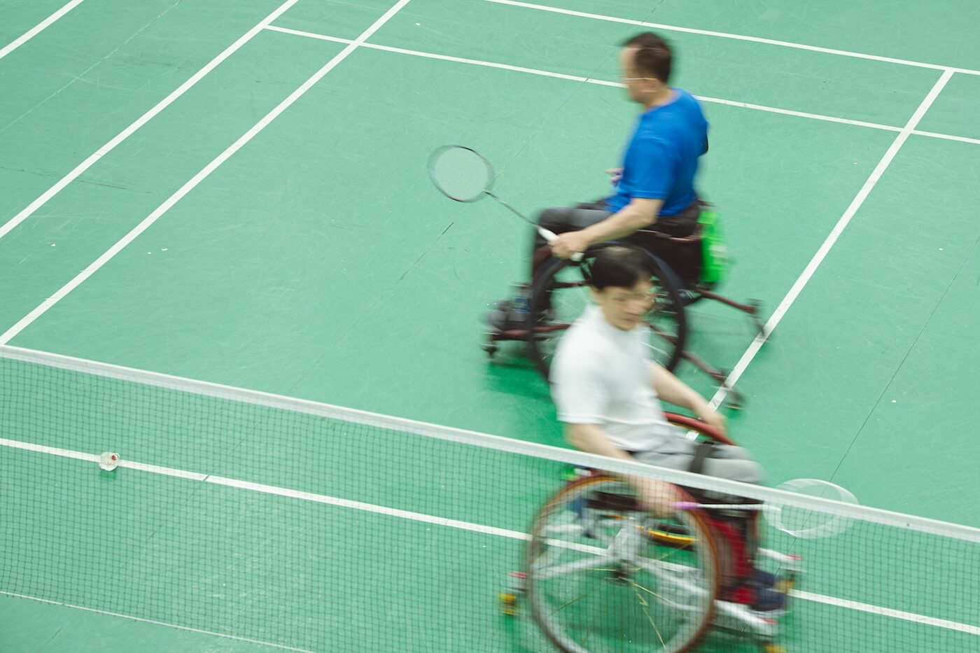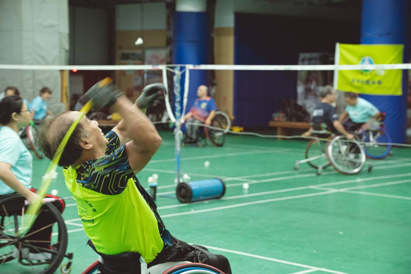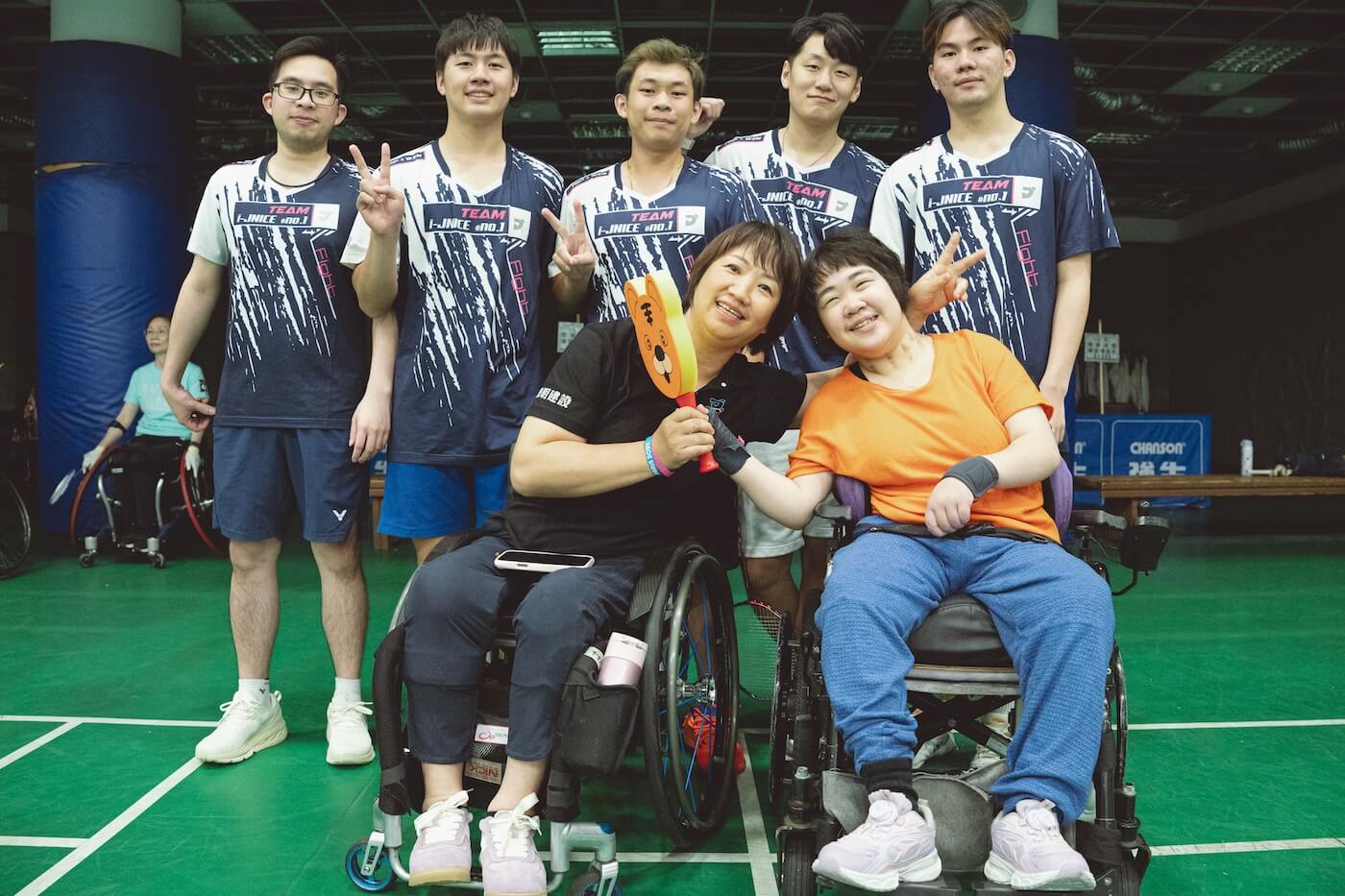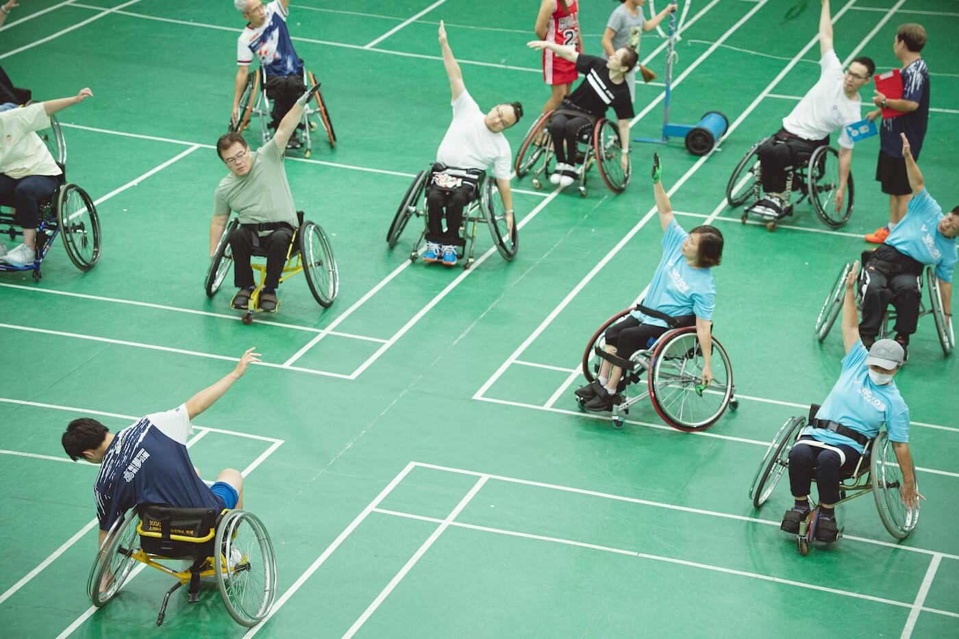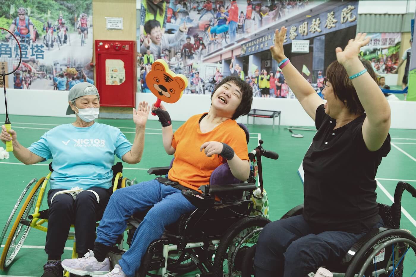 呂嘉儀也是輪椅夢公園的教練之一,看了看時間,週日下午,恰好是輪椅羽球班練習的時段,她領著我們去球場,「有些是小兒麻痺、有些是脊隨損傷⋯⋯,那邊是他們的家人,練習的時候有些會在旁邊幫忙撿球或收球啊,有些可能就去體育館別的地方運動。」