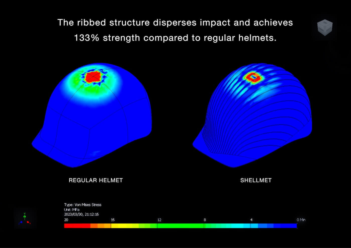 而回到安全帽的關鍵本質:「安全」,設計團隊強調,由於將扇貝殼特有的肋狀結構融入其中,成功讓 SHELLMET 比一般安全帽高出 133% 的強度,在硬度、耐用性以及吸震性能上均符合國際標準。相比傳統的全塑膠安全帽,生產過程也更加環保:減少高達 36% 的二氧化碳排放量,且製作材料完全來自回收與廢料。一頂頂 SHELLMET 問世,每一頂都飽含了研發團隊的細心與對環境永續的堅持。