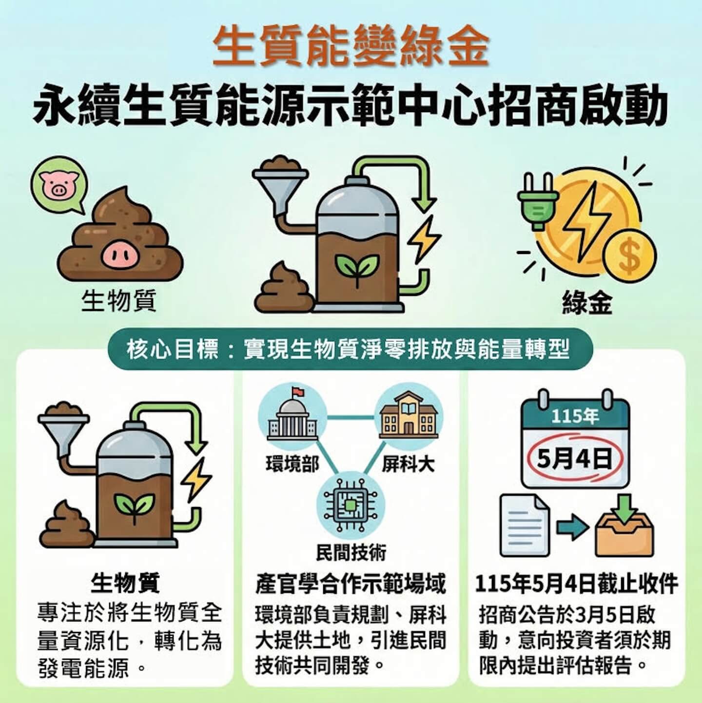 環境部表示,本案自115年3月5日起至115年5月4日止,將引進具備生質能源實績之技術廠商。該計畫以技術示範為導向,透過研發資源的整合,規劃轉型為國內綠領人才培育基地,並落實淨零技術的場域實踐。