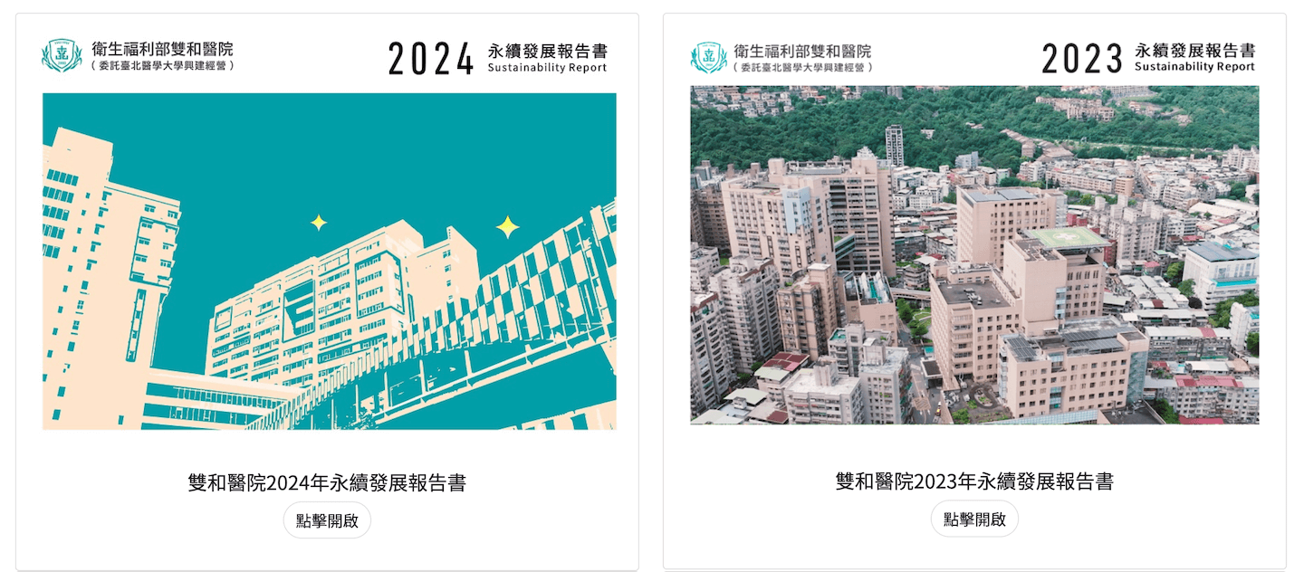以「臺北醫學大學附設雙和醫院」為例,其2022年起公開發布永續報告書,大眾可自由檢視醫院碳排放、能源管理與永續治理策略的系統規劃,並透過資訊透明化與治理成熟度提升來強化利害關係人信任。