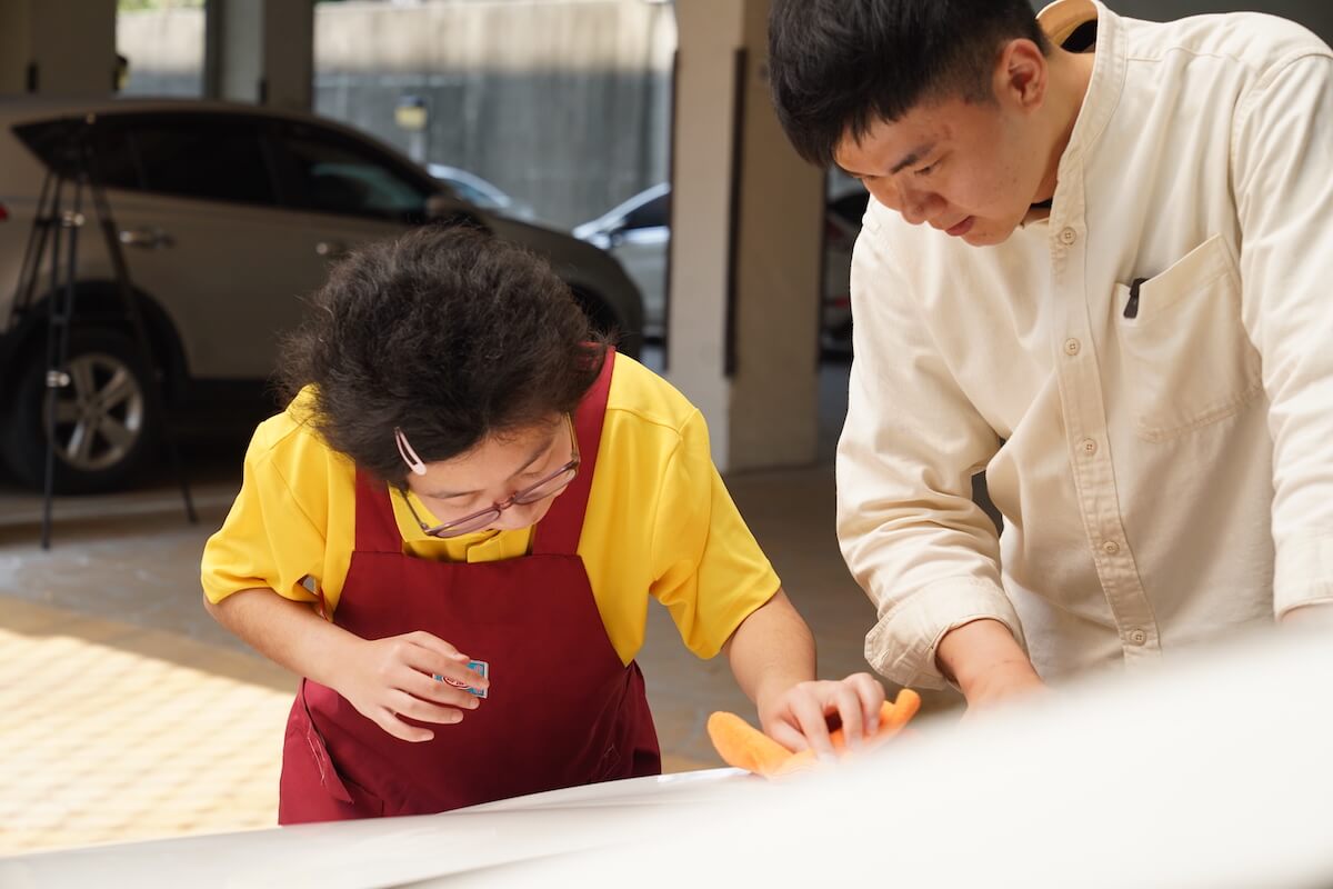 在 Doiiin 的牽引下,邀請 K-Wax 凱閎國際有限公司希望以自身的力量來助力圓夢,「身為台灣企業,想要做一些在地回饋幫助弱勢者。」老闆K大透過校長得知苗特設有有汽美科專業後,因為符合自家專營汽美材料產業,過去也有特殊生教育經驗,所以提出可以做公益教學,希望透過實際行動來拋磚引玉,延續這份力量。