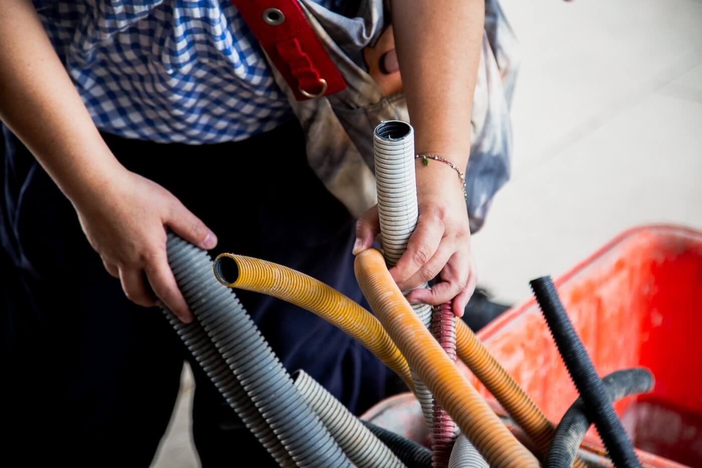 逐一走訪每個建案案場時,隨處可見的水泥、帆布、水管等等擱置在一旁。在桃園宜雄建設,每年在營造過程中都會產生像這樣一批的建築廢料,除了將剩餘的水泥做成水泥磚來砌牆外,剩餘的短鋼筋則會拿來做牆面植筋,減少工地廢料的產生。