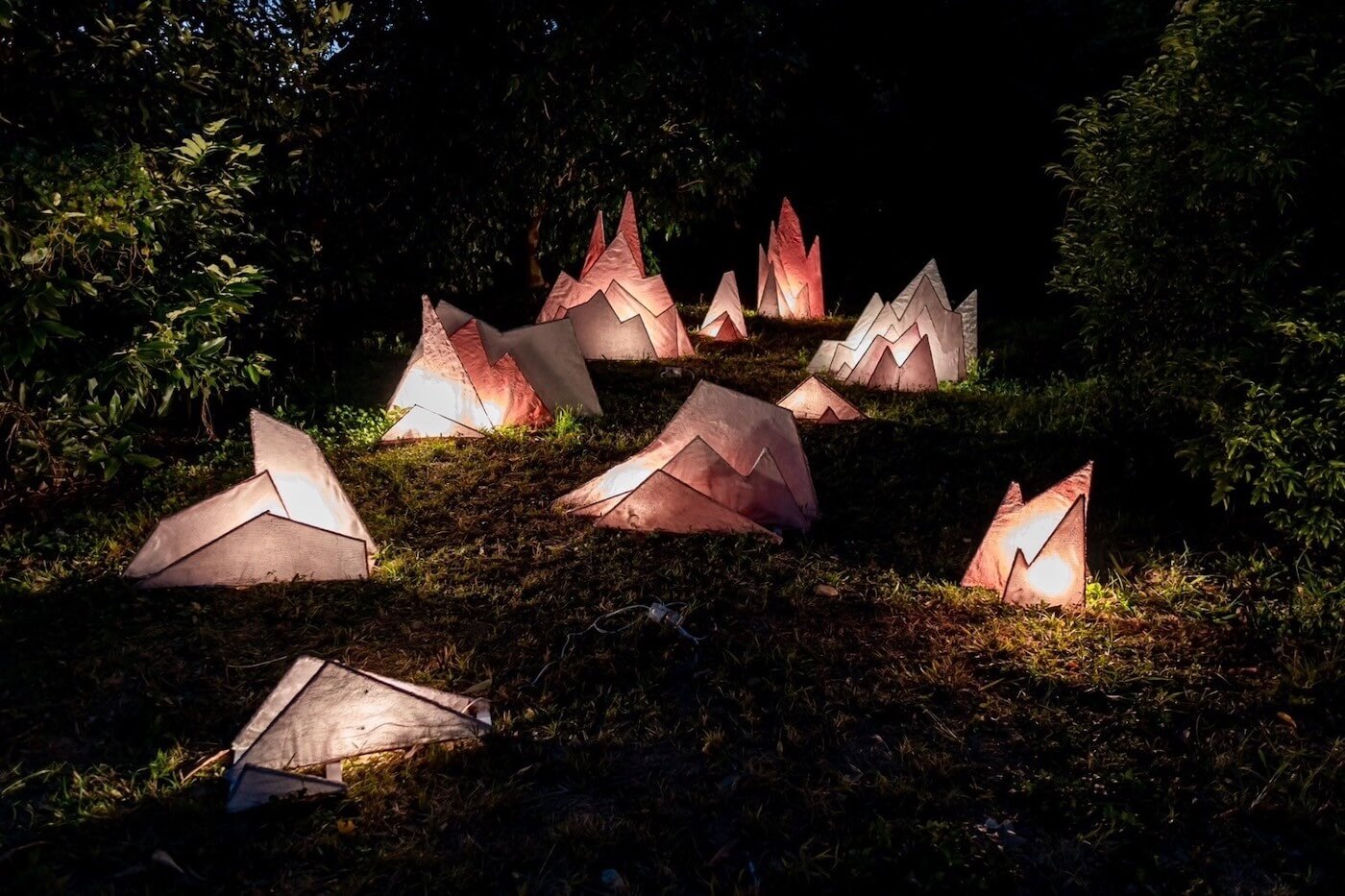 在「複合媒體概述與創作」中,廖敏君老師運用水管中的紋路與材質,指導學生挖掘廢棄建材延伸的可能性;段存真老師「複合媒體」課程,則引導學生突破媒材限制,讓建築案場的廢棄材料作為學生提案的發想,結合對材料再生與環境永續的關注,在校園創作四件裝置藝術作品,藉由多樣的燈具照明方式,讓作品在夜間表現出具有豐富層次的燈光效果。